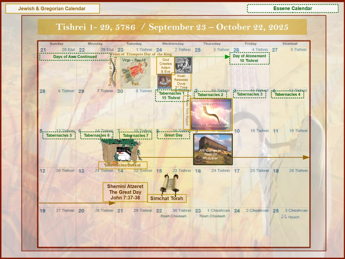 The High Holy Day span both the Essene and Jewish Religious calendars of Elul & Tishrei. Giving the Gregorian calendar dates is to help those who do not follow either of the other two. Hence this chart will be on both calendar pages for your convenience. The purpose is to show how one is symbolic to the other as the LORD our God reveals many of His secrets this way.