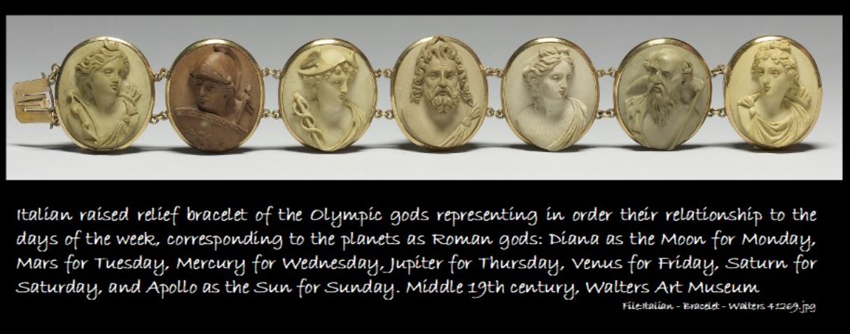 Saturday: named after the Roman god Saturn associated with the Titan Cronus, father of Zeus and many Olympians. Its original Anglo-Saxon rendering was Sæturnesdæg (pronounced [ˈsæturnezdæj]). In Latin, it was dies Saturni, "Day of Saturn". The Scandinavian Lørdag/Lördag deviates significantly as it has no reference to either the Norse or the Roman pantheon; it derives from old Norse laugardagr, literally "washing-day". The German Sonnabend (mainly used in northern and eastern Germany) and the Low German words Sünnavend mean "Sunday Eve", the German word Samstag (mainly used in southern and western Germany) derives from the name for Shabbat." ~ Wikipedia - Names of the Days of the Week