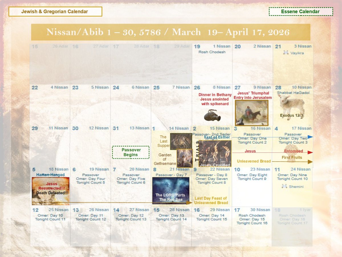 3 - 10 Nissan ~ Referencing Essene Calendar application from Adar 19 ~ Essene Calendar (Dead Sea Scroll Calendar) is well worth investigating. "The Dead Sea Scroll Calendar maps time from Creation to the New Heavens and Earth, spanning seven thousand years." ~ Dead Sea Scroll Calendar It is renown for marking the solstices and equinoxes with extreme accuracy which many believe in turn gives a true time piece for the Feasts of the LORD. These He gave to mankind to not only mark points in time in where He has performed great feats on behalf of His children in the past, but the Feasts also point to events in the future. These help us to keep watch something we are commanded to do.